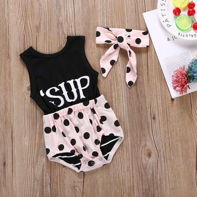 BEST QUALITY Newborn Baby Girls Short Sleeve Pink Dot Design Black Rompers+Pink Turban 2PCS Clothing Sets Casual