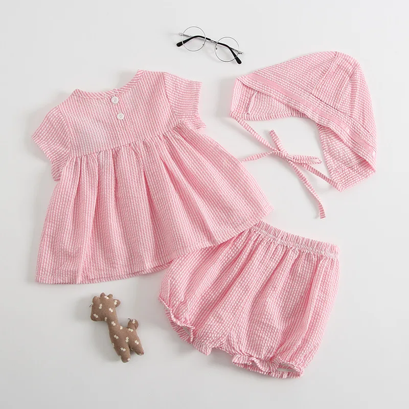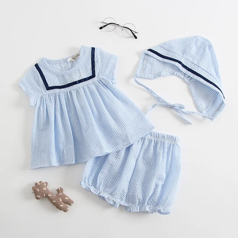 2018 New Fashion Summer Baby Girl Romper Toddler Solid Striped Top Shirt + Shorts + Hat Infant Chil
